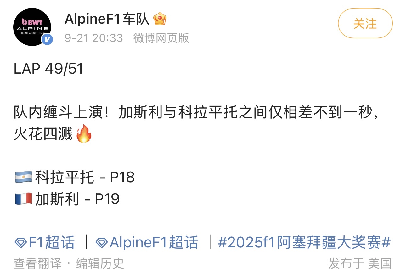 比赛中途扣在换胎之后就触发了法拉利经典tr,问"If we are not under threat, why did we stop now? Just to know"(哥们已经完全被pua到习惯了),车队回复说"we can discuss it later"。本来以为法拉利这样已经很好笑了没想到迈凯伦更为幽默……总之朵P2完赛又追了三分回来,为争冠稍稍增加了一点点悬念。